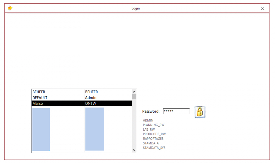 Via ERP-Desktop, kun je afhankelijk van je inlog-rechten, gegevens wel of niet inzien en wel of niet bewerken. Hiernaast is het inlog scherm waar wordt bepaald wat de rechten zijn van de gebruiker en wat zijn of haar rol is in het systeem.
