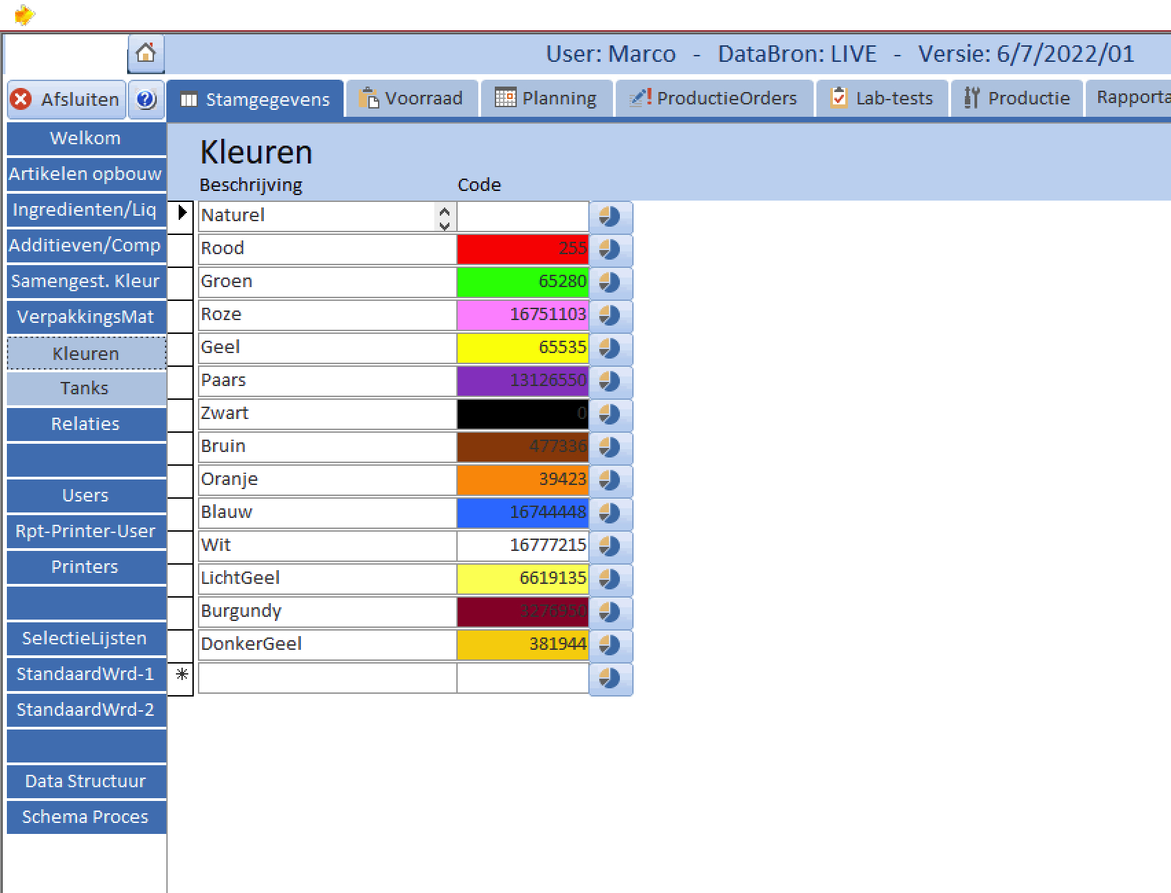 Andere stamgegevens die beheerders kunnen instellen zijn, onder andere: kleuren van het eindproduct, Zebra-printers instellen, user-rechten instellen, basis-artikelen lijst beheren, etc.