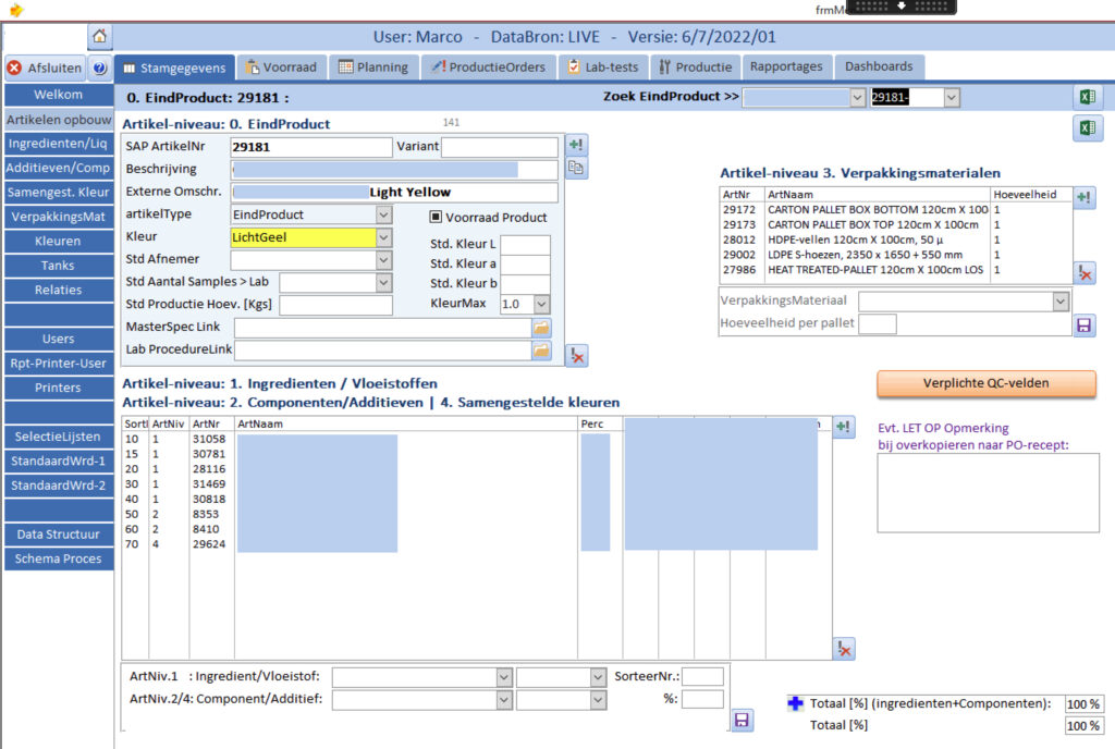 In dit scherm bouw je het eindproduct op door artikelen toe te voegen met een bepaald percentage die samen 100% van het product maken. Via de oranje knop ‘Verplichte QC-velden’ kan worden ingesteld welke kwaliteitstesten het laboratorium verplicht moet doen voor dit eindproduct. (De artikelnamen en samenstelling zijn afgelakt).